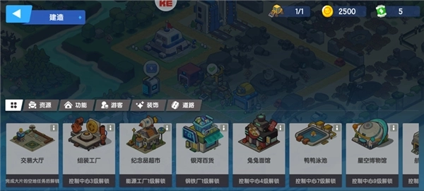 资源、功能、游客、科技、装饰与道路这类排序能够进行增减等相关操作