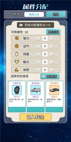 2、接下来对属性点进行自由分配,同时挑选初始加成道具。