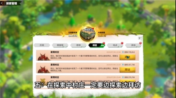 在探索中,奇观任务优先完成,里面有4个任务,完成后有丰富的奖励,在探索中村庄一定要边探索边拜访,村庄里面有大量的前期开荒道具跟加速,还有额外的惊喜奖励。