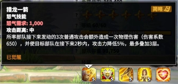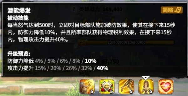 在怒气值达到500时,对敌方部队施加破防效果,并在一段时间内提升自身物理攻击力。机制特殊,实战中效果相当优秀的技能;触发条件较为轻松,效果能较为轻松的覆盖到主动技能,非常适合以主动技能为主要输出手段的英雄。