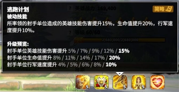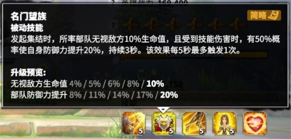 增加所率部队的英雄技能伤害、生命值和行军速度。输出方面可以增加英雄技能伤害,防御方面则可以增加生命值和行军速度,综合来看还算优秀。