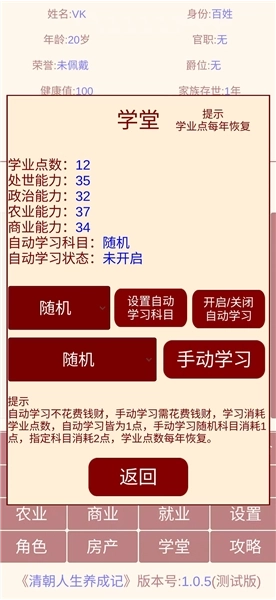接下来便是持续重复的流程,前期必须完成的是学业与官职任务,晋升正一品需要2000点政绩以及18级的文学等级。