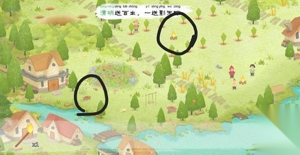 8、点小孩手里的木棍(有点小,放大看),把木棍放进河对岸的火里,再把木棍给小孩(还有三处火堆场所如图)然后让我们视线归来右上角的茶伯伯这里。