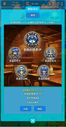 推荐开局刷出至少精锐品质的法师、龙卫和剑士来开荒:剑士的技能是获得自身30%血量的护盾,可作前排承伤;龙卫定位前中排输出,兼顾一定的战场压制力;法师则站后排专注输出。至于其他下位替补角色,优先选择冒险者、盗贼这类自带群攻或高伤技能的,能提升队伍的清怪效率和爆发能力。