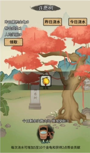 每日许愿,第二天帮会所有成员都可以平分领取许愿奖励,金龟奖励不容错过!查看帮会谁还没有浇水,赶紧嘟嘟他去吧!