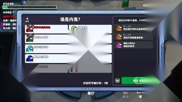 是本游戏的强制环节,当有人报告发现尸体的时候,所有人进入讨论,并且进入投票,票数最多的被扔出空气闸。另外,在游戏过程中,也可以按下紧急按钮,强制进入游戏讨论,紧急按钮每局游戏也有限制次数。