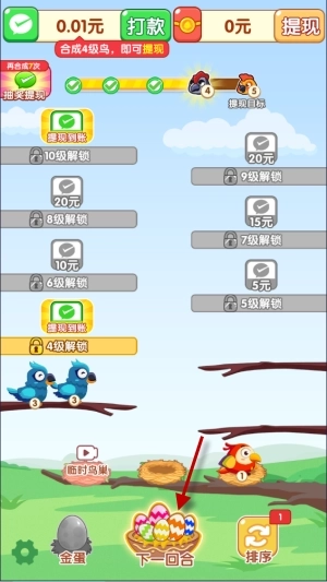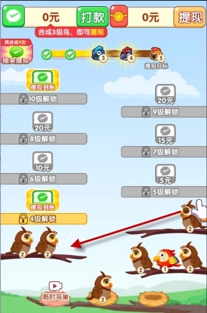 2、当同一树梢上聚集了三只相同的小鸟时,它们会自动合成,解锁新的小鸟种类,同时你还能获得红包奖励。