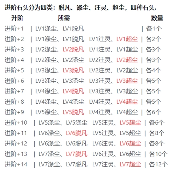 进阶石头分为脱凡、涤尘、注灵、超尘四类,这四种石头……