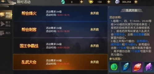 玩家等级达到50级或更高时,即可参与乱武大会活动。该活动于每周一、四、日的16:00和20:30开放。符合等级条件的玩家都能报名参加,报名阶段结束后将停止接受报名。玩家完成报名后,会进入乱武大会的活动场景。