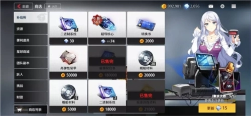 补给所每日可使用钻石刷新5次,每次消耗15颗钻石。补给所内的商品能够用金币或钻石进行兑换,这些商品均为制作、强化以及突破过程中所需的各类材料。