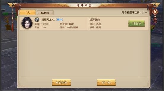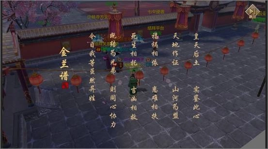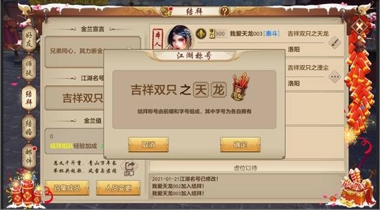 玩家可以到洛阳的王夫子那里,定制专属于自己结拜关系的江湖名号。这个江湖名号分为名号和字号两部分,其中名号是结拜成员共同拥有的。