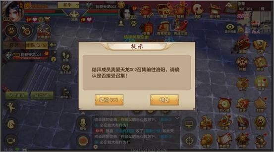 结拜关系确立后,在对应的结拜界面会出现“召集成员”的功能选项。结拜成员中的任意一人点击该功能后,其他成员都能选择立即传送至发起召集者的身边。不过需要留意的是,这个召集功能存在30分钟的冷却时间,而且处于战斗状态时是无法被召唤的。