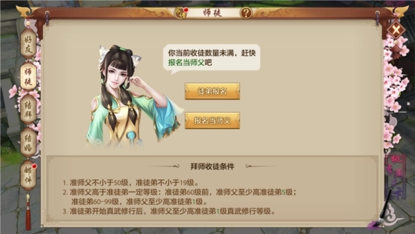 想要成为师父的少侠,需满足至少50级的条件才能收徒,并且等级要比准徒弟高出一定差距:徒弟等级在60级以下时,师父等级需比徒弟高5级;徒弟等级处于60到99级之间时,师父等级需比徒弟高1级;当徒弟开启真武修行后,师父的真武修行等级则需比徒弟高1级。