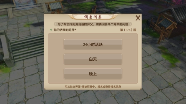 想要成为师父的少侠提交问卷后,系统会留存其信息,一旦有合适的徒弟,将第一时间联系该少侠;而想要成为徒弟的少侠填写完问卷后,系统会依据问卷要求,结合其他申请成为师父的少侠所填问卷的条件,为其进行匹配推荐。
