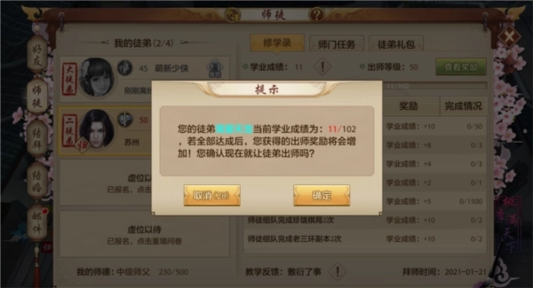 少侠作为徒弟,等级达到50级即可出师;出师之际,师徒双方将依据徒弟当前修学录的学业成绩获取奖励,若徒弟已完成修学录的全部内容,其出师奖励还会有所提升。