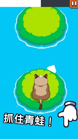 6、不爽猫打算跳过荷叶去捕捉青蛙,我们能看到猫咪所站的荷叶上有白色小箭头在移动,这代表着它的跳跃方向,只需观察前面荷叶的位置和方向,然后依次跳过去就行啦。