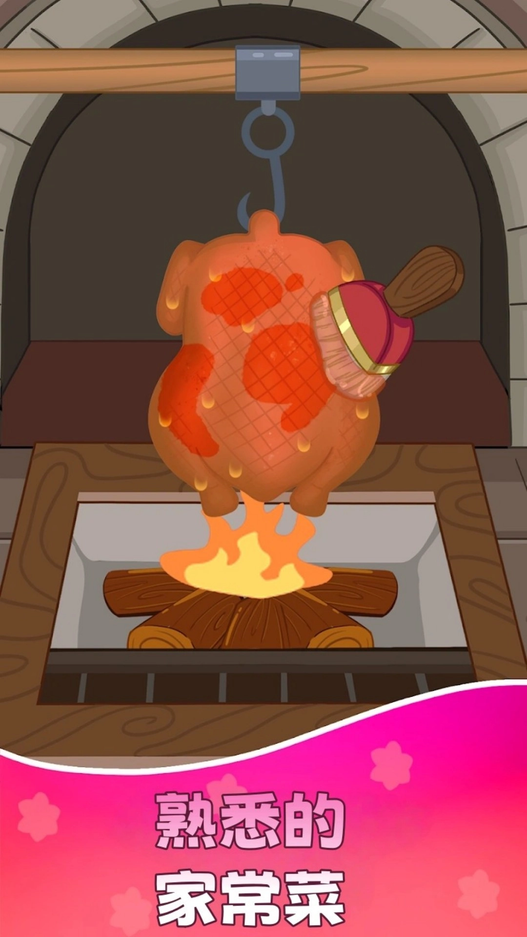 选想做的家常菜,进入烹饪界面,按提示用工具刷子刷酱控制火候,完成制作。