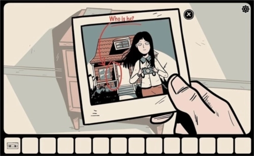 桌上摆着酒和奶酪,那瓶酒却像粘在桌面上似的拿不起来,你只好用石头将它砸破,里面居然藏着一把小钥匙;你还捡了片碎玻璃当作防身的利器。小柜子上放着一本日记,里面记录了蓝衣男人的一些事,内容和相片里的记载大致吻合,感觉这个男人一直在监视这间屋子。翻到日记的空白页时,红色的字迹突然浮现:“最后,我什么也写不了了。”日记旁有张照片,长发少女站在屋子前,可屋子的窗边却站着一个黑影。