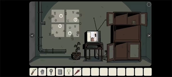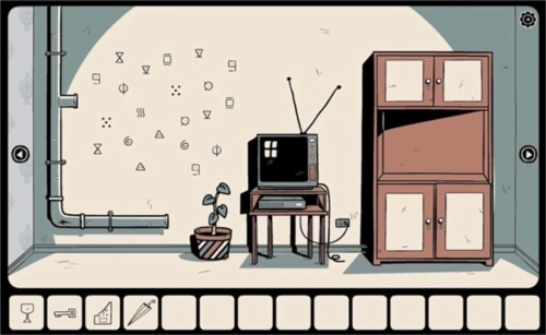 你用火柴点燃蜡烛,借烛光照亮脚边的老鼠洞,发现洞里有个插头,便用雨伞将它勾了出来。随后走到电视机旁,用钥匙打开柜子顶端的门,找到了胶带。现在你可以用胶带把插头和断裂的电视机电源线连接起来了。按下电视开关,屏幕却没有任何节目。你把录像带放进录像机,屏幕终于出现了画面:一个长发女孩背对着镜头,正在往墙上画着什么,你看到两个圆和几条横线,图案类似时钟面板。画面里的门正是你所在房间的房门,旁边矮柜上还放着一个旋钮——那正是电视机上缺失的零件。