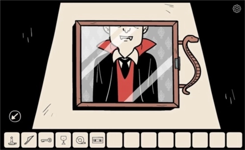 现在终于能打开最后那扇柜门了,从中取出一把螺丝刀和一瓶红酒。有了螺丝刀,就可以去拧吸血鬼画像画框上的螺丝钉。当两颗螺丝钉都掉落后,你忽然发现画里的景象变了——吸血鬼变成了那个长发女孩,她的一只胳膊从画中伸出来,像是要抓住你。你本能地抬手挡住脸,却没感觉到任何异样。再看向那幅画时,长发女孩不见了,还是原来的吸血鬼。打开画框,后面藏着一个图案谜题。你想起告示板后面的大蒜、十字架之类的东西,这些不都是和吸血鬼相关的物品吗?于是你按顺序先拿出大蒜,吸血鬼吓得用披风遮住脸,同时画上出现了右侧三角为黑色的图案。接下来是杯子,空杯子对他没用,你把红酒倒进杯子里再递过去,他嘴角泛起一丝红色,随后伸手在玻璃上画了个红色的X,这应该意味着构成方块的四个三角都得是白色的。然后是十字架,画上出现了左右三角为黑色的图案。最后是镜子,它照不出吸血鬼的身影,画上便只出现了左侧和下方三角为黑色的图案。把这四个图案输入画后的谜题中,听到了正确的提示音,拉动把手,后面的开关就露了出来。
