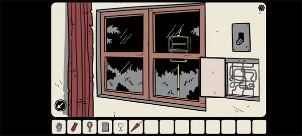 用钥匙能打开电视机旁大柜子底下的一扇门,取出玻璃碗。走到房门前,装好开关面板,就能控制屋内电源的开关了。先把电源关掉,戴上绝缘手套去处理窗户边的电线,接好后按下开关,屋外的强光灯就亮了。你拉上窗帘,发现上面有几个破洞,强光透过破洞照在对面墙上,映出几个特定的符号。你望向那面墙,突然一个黑影闪过,吓了你一跳。墙上的符号加上书中的提示,就是窗下密码锁的密码。你正要解锁时,一只手缓缓搭在了你的肩膀上,你心里一惊,转头看去,身后却空无一物。抽屉里放着一根撬棍。