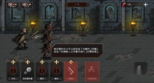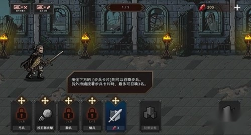 1、打开游戏进入教学关卡,跟随指引逐步熟悉游戏操作,按住屏幕下方的步兵卡片可以召唤步兵,持续按住最多可召唤3名步兵。