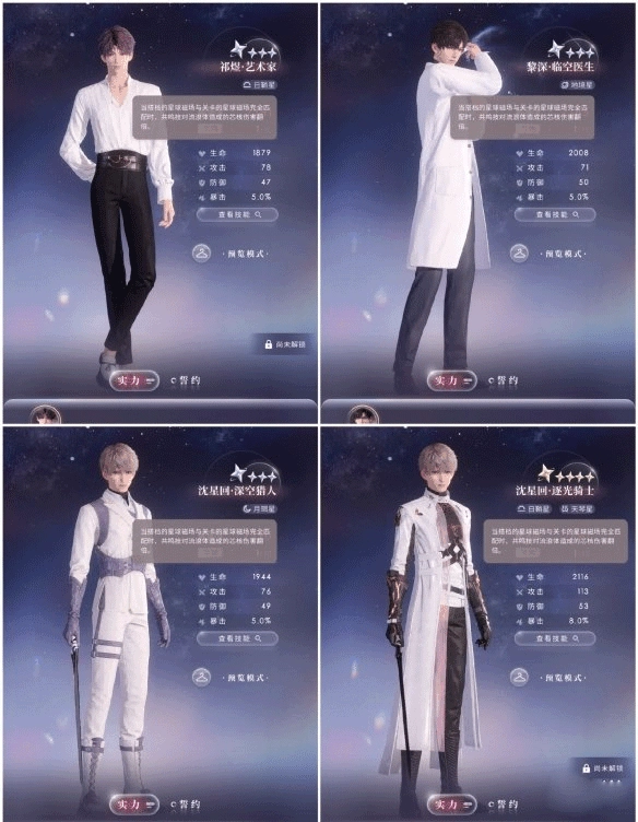 以沈星回为例,五星“逐光骑士”与四星“深空猎人”套装相比较:“逐光骑士”基础属性面板较高;