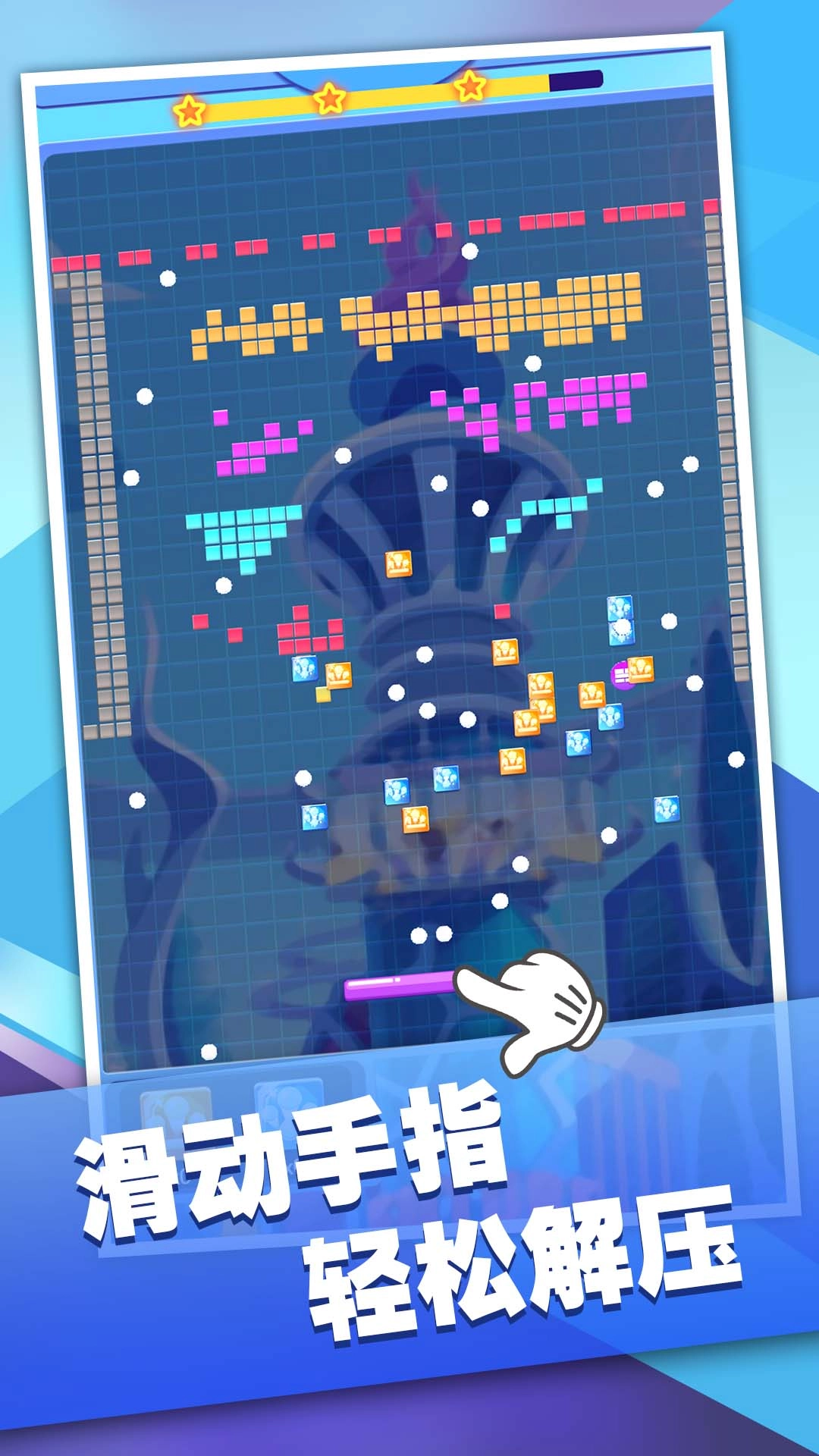 游戏里有打不完的弹珠和砖块,完全不用怕弹球掉下去就结束游戏,只要操作够厉害,就能一直冲击更亮眼的分数。