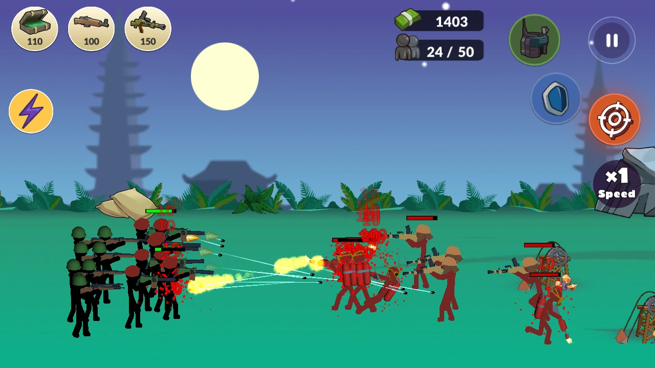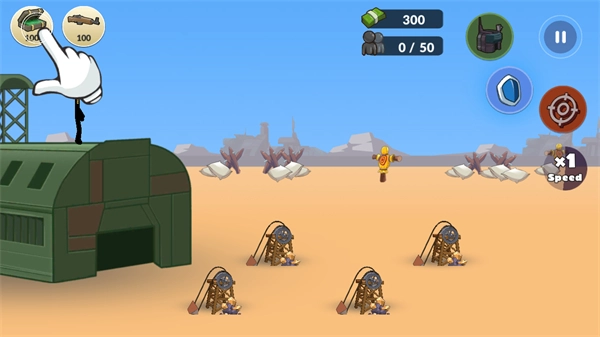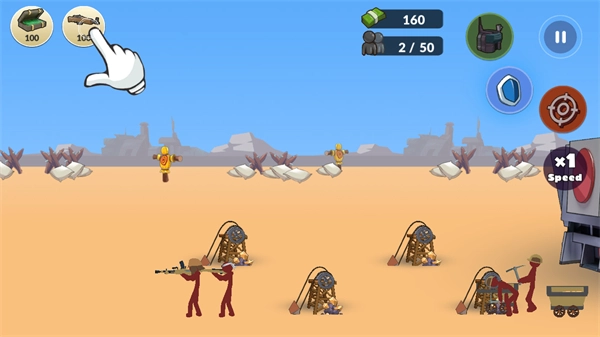 采用横版战斗布局,配以简约清晰的画风,着重展现火柴人风格的战争场景,色调简洁却极具表现力。