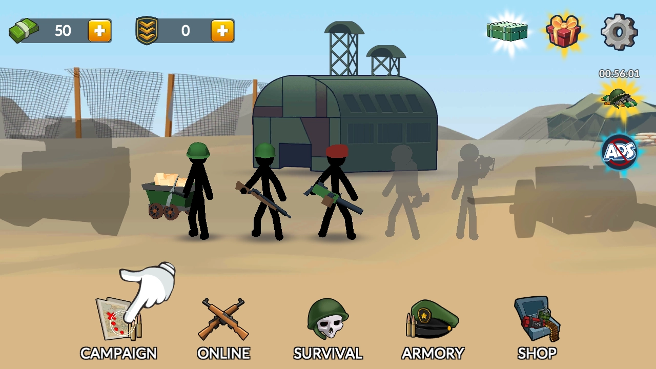 《火柴人第二次世界大战》是一款以二战为时代背景的横版策略射击游戏。在游戏里,玩家能够招募矿工来收集资源,购买各种各样的兵种和武器,打造出强大的军团,在多样的地图中感受紧张刺激的战斗。该游戏操作简便,容易上手,画面风格简约却能营造出浓厚的战争氛围,还支持关卡闯关和实时匹配对战模式,十分考验玩家的指挥才能和战术运用能力。