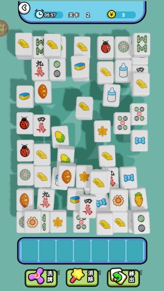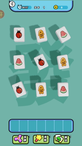 在第一关里,玩家得在一分钟内把这些瓷砖配对消除。点击图案相同的砖块放到下方,凑够三个就能消除。