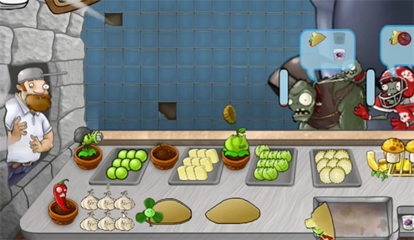3、玩家得持续制作食物,这样才能把僵尸客人送走,要是食物断供了,闯关就会失败。