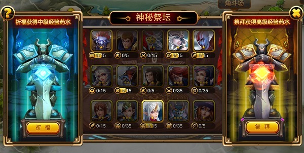 地图中央有一处名为神秘祭坛的所在,你能在此处通过收集碎片或是祈福祭拜的方式召唤英雄,解锁后的英雄便能登场使用。