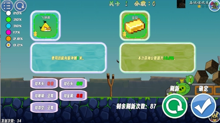 游戏里获取小鸟的方式是随机刷新,每次挑战时,我们玩家都能通过刷新来得到自己心仪的小鸟,还有不同组合的道具。不同星级的小鸟,它们的技能效果也不一样,像黄色小鸟在一级的时候,技能甚至会产生负面作用,只有达到二星及以上,才会有比较大的加成效果,例如提升距离。