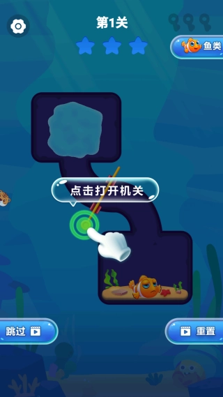 点击“开始游戏”后,你会进入氛围舒适的益智解谜关卡,通过操作帮助小鱼脱离困境,游戏的呈现效果十分出色。