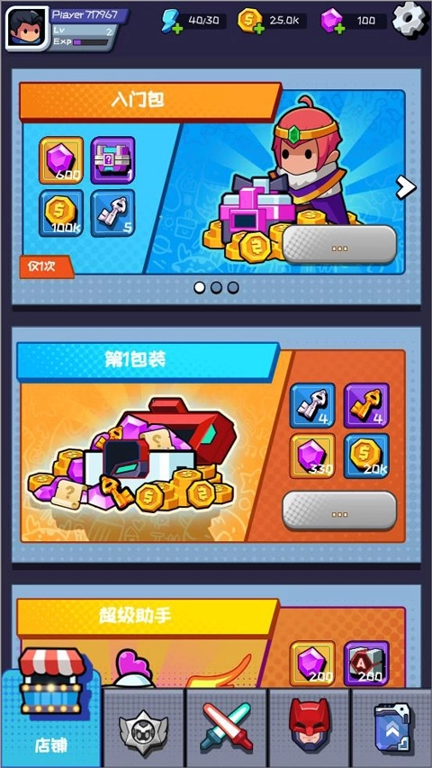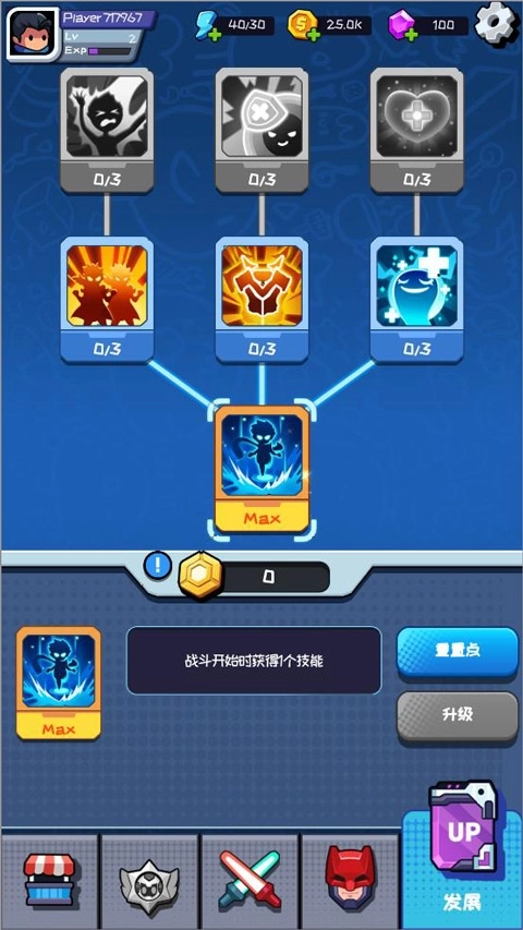 2、当玩家完成第一节的通关挑战后,将解锁商店、英雄以及升级这三项功能。在此之后,玩家就能够使用在游戏过程中获取的钻石,在商店里购买升级所需的各类材料了。