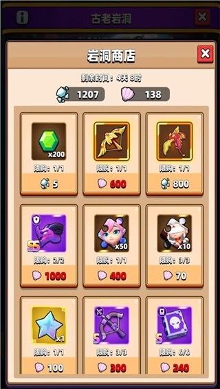 我们在挖矿的时候,能得到许多「贝壳」和「铁矿石」,等积攒到足够数量,就可以去岩洞商店兑换奖励啦,里面有钻石、凤羽连弩、火龙之镰、虚空龙、英雄碎片这类不少珍稀道具呢!