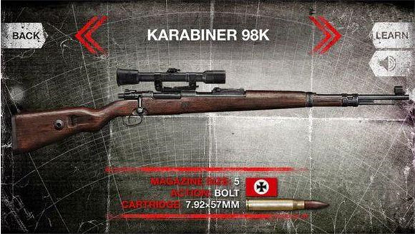 3、karabiner 98k(98k毛瑟步枪)在游戏中能够加装瞄准镜和装配刺刀。