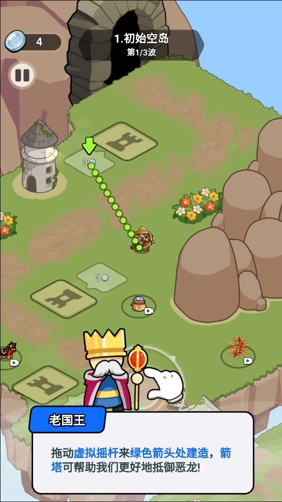 2、拖动虚拟摇杆前往绿色箭头指示的位置进行建造,箭塔能够协助我们更有效地抵御恶龙!