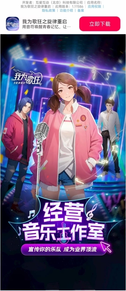 《我为歌狂之旋律重启》正版游戏2025最新版本惊喜呈现!这款由互爱互动(北京)科技有限公司精心打造的手游,获得超人气动漫IP正版授权,完美还原原著角色并卡牌化,等待玩家收集养成。游戏包含完整的女明星歌手成长计划,搭配多元化音乐工作室经营模拟玩法,带来过瘾又刺激的体验!