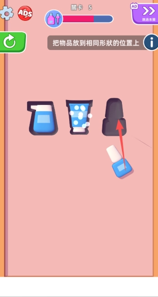 先观察要放置的物品外形,在界面里找到形状完全契合的空位,把物品移到这个位置,就能完成单个物品的归位,让关卡进度往前推进。