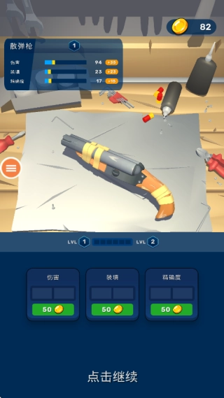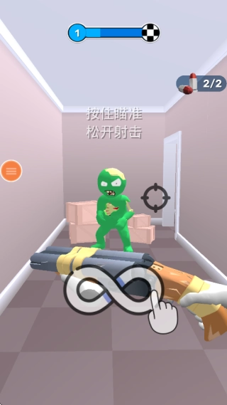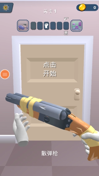 像图中展示的那样,在第一关里我们仅配备了一把散弹枪当作武器。点击屏幕的任何一处就能进入房间开启战斗。