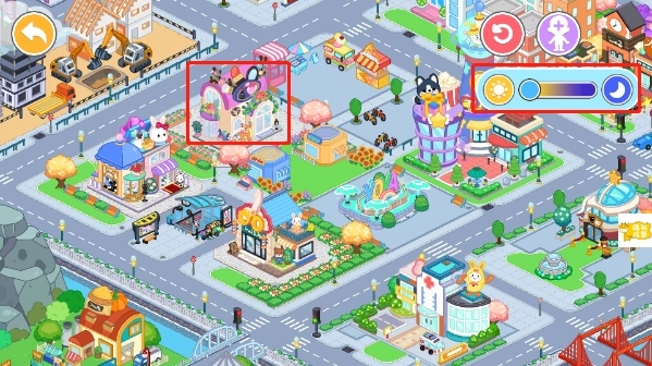 1、进入游戏后,我们可以通过右上方的滑轮来切换当前时间对应的风景,选择不同的建筑就能进入相应的场景。