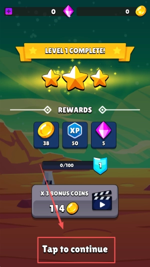 领取奖励的方式是:点击“Tap to continue”按钮,即可获取“X3BONUSCOINS”等奖励,随后进入下一关。