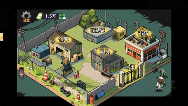 在基地场景里,玩家能够查看仓库、收藏室、市场和队员等功能面板,点击“外出”按钮就能进入地图展开战斗。