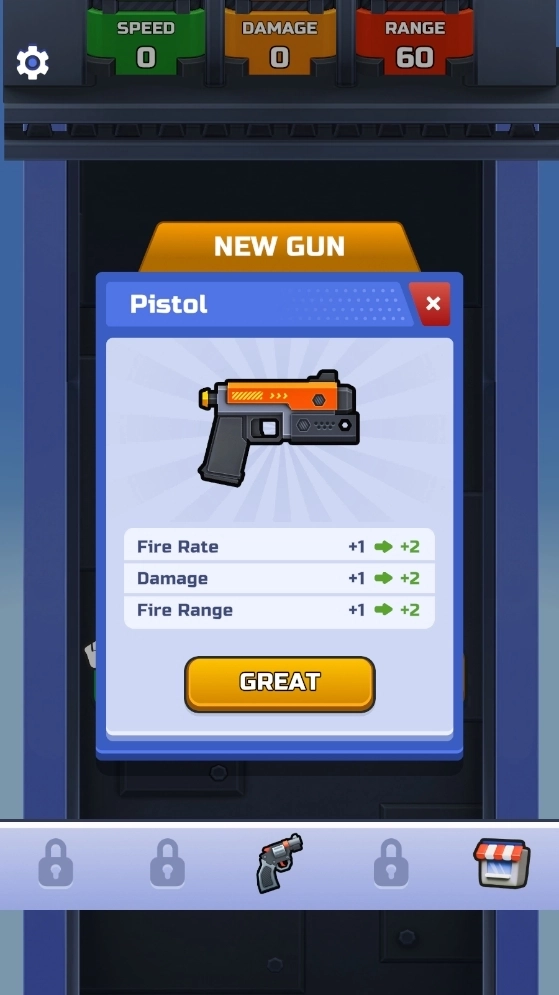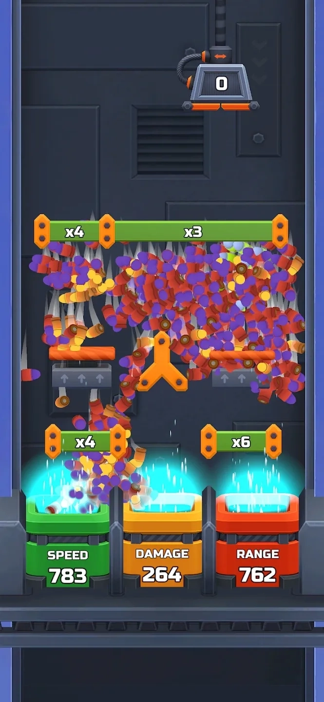 1、进入游戏,滑动屏幕进行移动,将子弹投入你想要加的属性里面,分别是速度、伤害、射程。