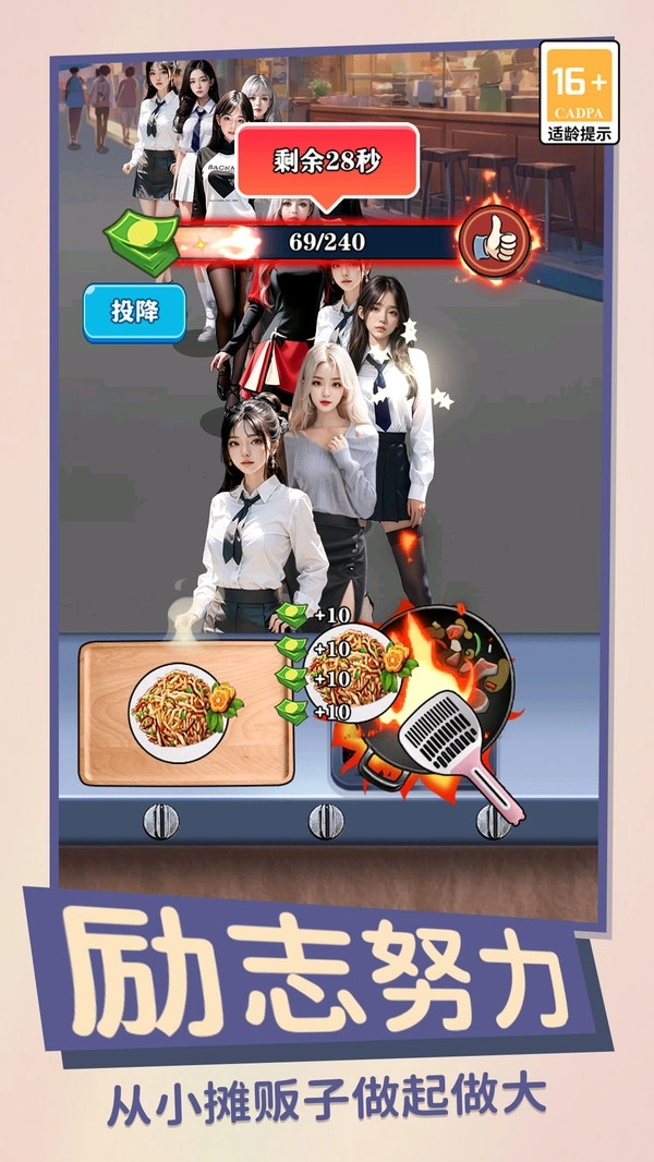 玩家将化身一位刚被女友分手的街边炒饭摊主,从社会底层起步,立志早日成为“希艺欧”,逆袭走上人生巅峰。面对生活的重重压力,你需要学会接纳现实,是选择被生活彻底击垮,还是勇敢直面困境?咸鱼能否翻身,所有抉择都掌握在你手中!