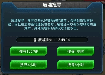 4.玩家可依据自身实际情况对废墟展开搜索,废墟的搜索时长选项有四个,分别为15分钟、1小时、4小时和8小时,供玩家自行选择。