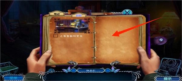 查看笔记以明确任务目标(例如寻找帕特里夏),然后根据线索在场景中找到对应的物品。