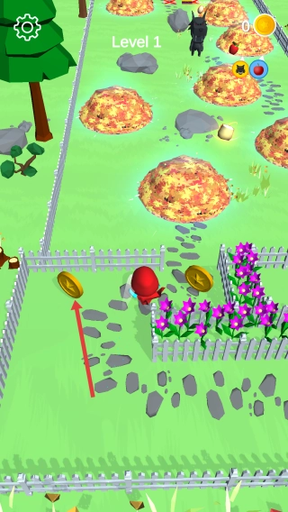 在场景里,引导角色顺着路径前进,躲开黑色怪物,收集金币以及道具(比如花朵旁边的物品)。
